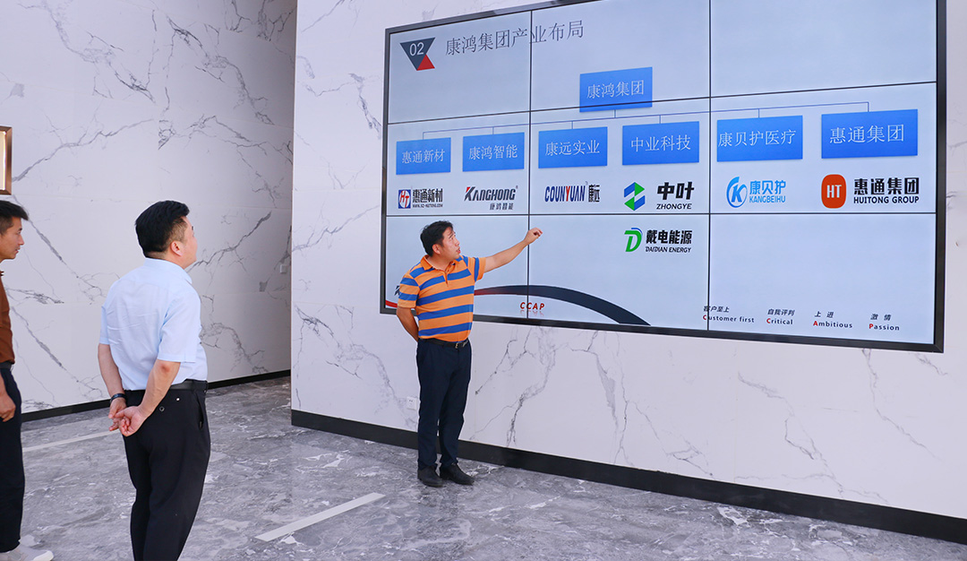 康鸿集团董事长赵国满 首先对临清市委领导的光临表示热烈欢迎,为山东省临清市市委副书记、市长雷启军、副市长王宏、市委常委、宣传部部长杜东平一行领导介绍康鸿集团的产业布局。